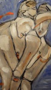 Affect. « Le jeune homme sourira sur la toile autant que celle-ci durera. Le sang bat sous ce visage de femme[1]». La passion exprimée par ces deux personnages, ces deux formes apparemment humaines n’est ni sexuelle ni sexuée, qui plus est, ni asexuelle ni asexuée. Qu’importe que nous ayons là des humains : puissance et courbures de ce déploiement sont à l’origine de l’émotion organique de cette toile. A qui appartient quel corps ? Nous en voyons deux – nous en croyons deux. Peut-être trois, quatre. Les membres n’appartiennent plus à l’un ou à l’autre, ils sont démembrés. Les articulations surgissent par-delà la peau, la croûte molle de corps indéfinissables. Cette imbrication molle, ces engrenages veloutés ; le rapport immédiat à l’œuvre est chargée de pulsions sans borne, sans délimitation. Le pinceau nie la loi de la chute des corps : ils ne chutent plus horizontalement mais verticalement, contre les corps étrangers. Cette chute possède, soumet et abandonne toute pesanteur. C’est la légèreté excitante du soi qui tient de repli sur l’autre.
